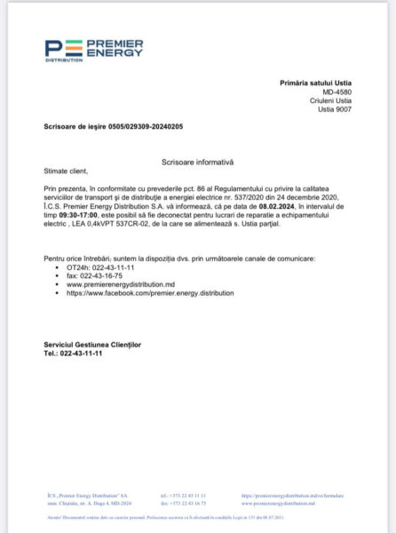 Vă aducem la cunoștință, că pe data de 08.02.2024, în intervalul de timp 9.30-17.00, este posibil să fie deconectată energia electrică.