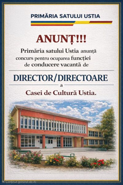 Primăria satului Ustia anunță organizarea concursului repetat pentru ocuparea funcției publice vacante de director/directoare al Casei de Cultură Ustia.